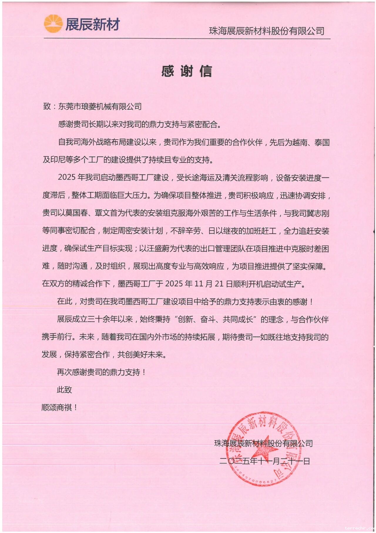 這封感謝信,是展辰新材對星空·全站APP登录入口在哪儿産品和服務的認可,也是雙方八年深度合作的見證——從2017年首次牽手到全球同行,這份情誼始終熾熱。